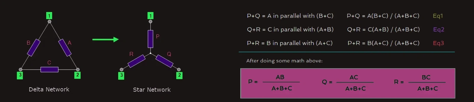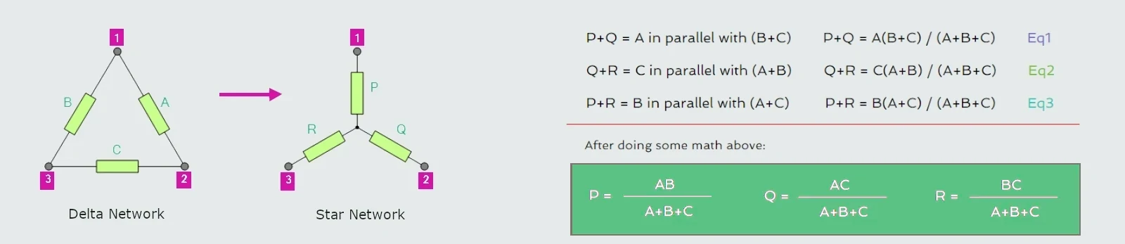 By rewriting the previous formulas a little we can also find the transformation formulas for converting a resistive star connected network to an equivalent delta network giving us a way of producing the required transformation.