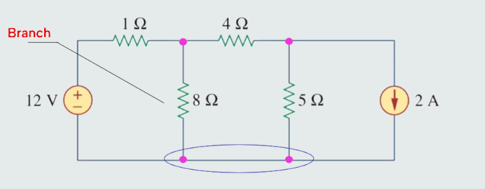 A branch represents any single two-terminal element such as a voltage source or a resistor with a node at each end of that element. Branches of a circuit give us the segments along which current flows and the voltage drops between those connections.